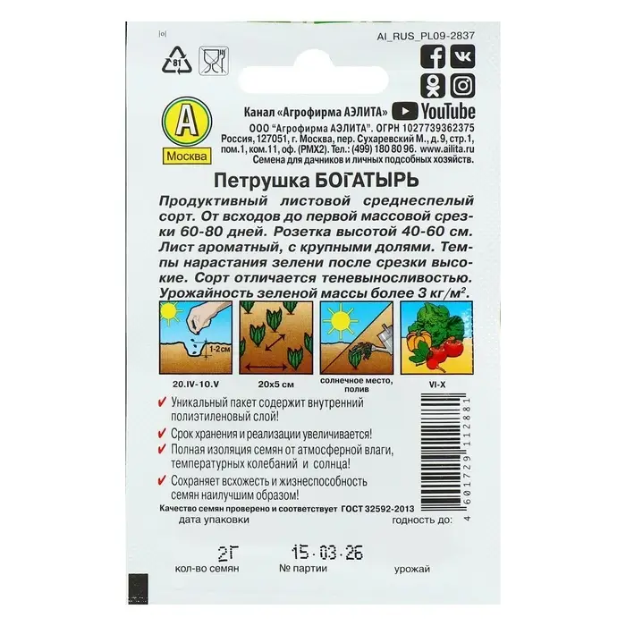 Благодаря внутреннему полиэтиленовому слою пакет не пропускает влагу и увеличивает срок годности семян до 2 лет.