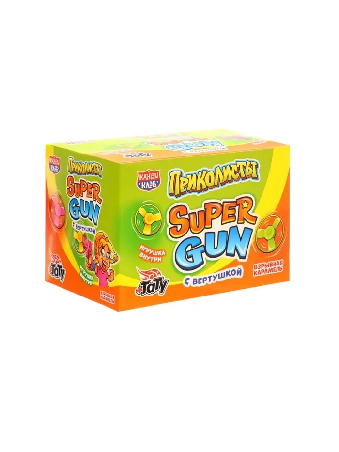 Миниатюрная взрывная карамель с сюрпризом «Super Gun» превращает обычный перекус в весёлое приключение. Сладкая конфета с яркими вкусами ананаса, колы, клубники, манго и голубики неожиданно шипит и искрится во рту, даря мгновение радости. В комплект входит маленькая игрушка и временная татуировка, добавляющие интерактивности и игры.