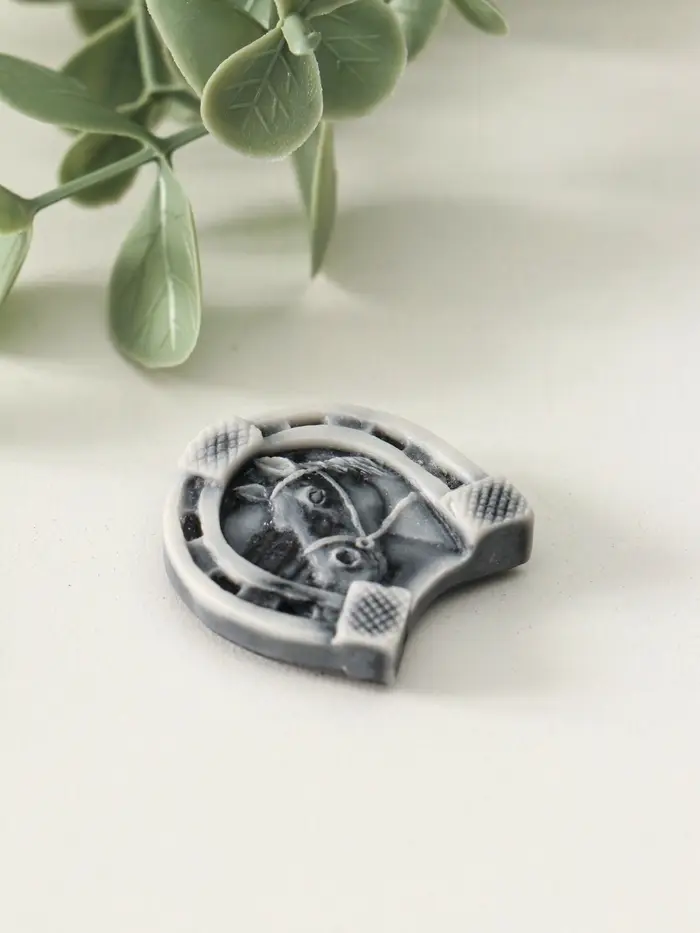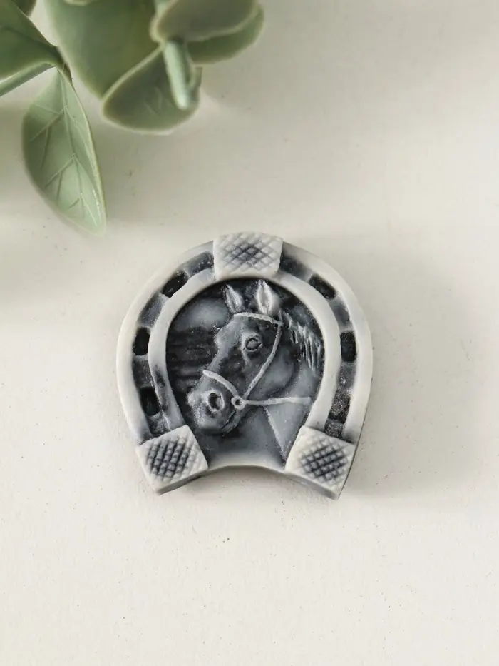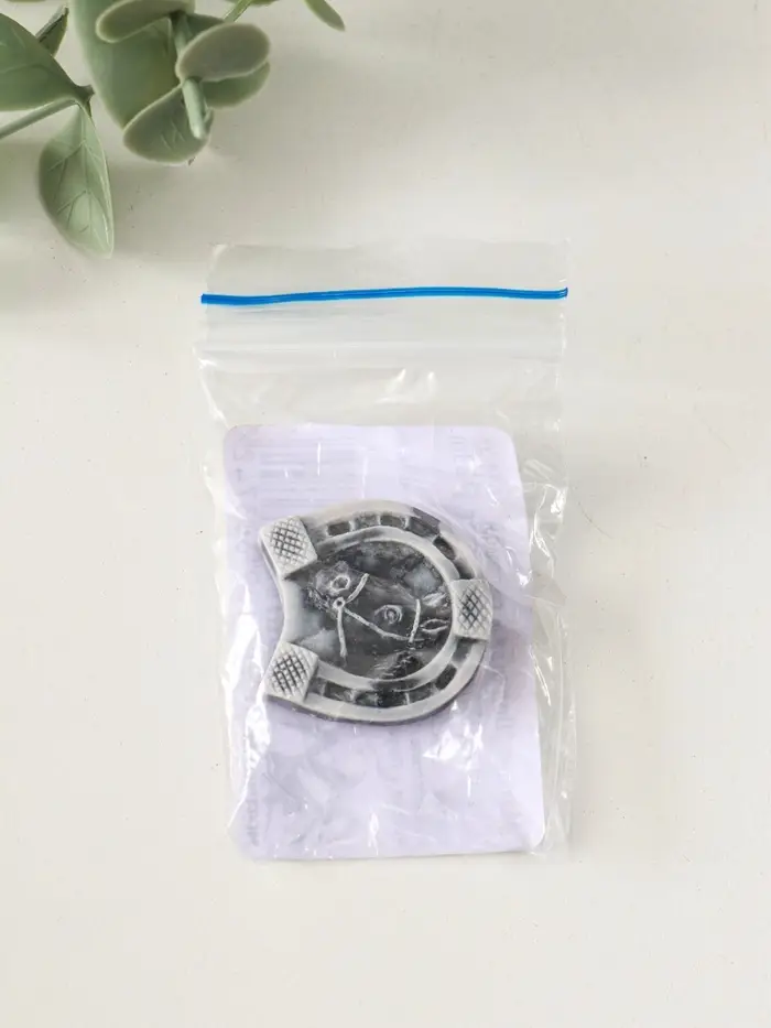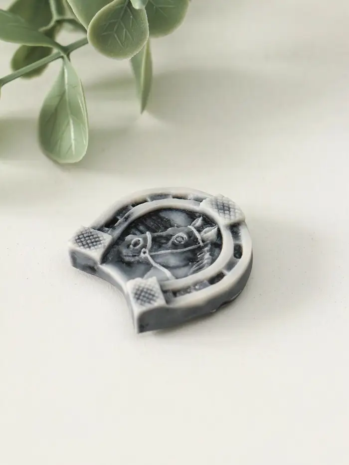 - Дизайн сочетает классическую подкову на счастье и детализированную голову лошади.
