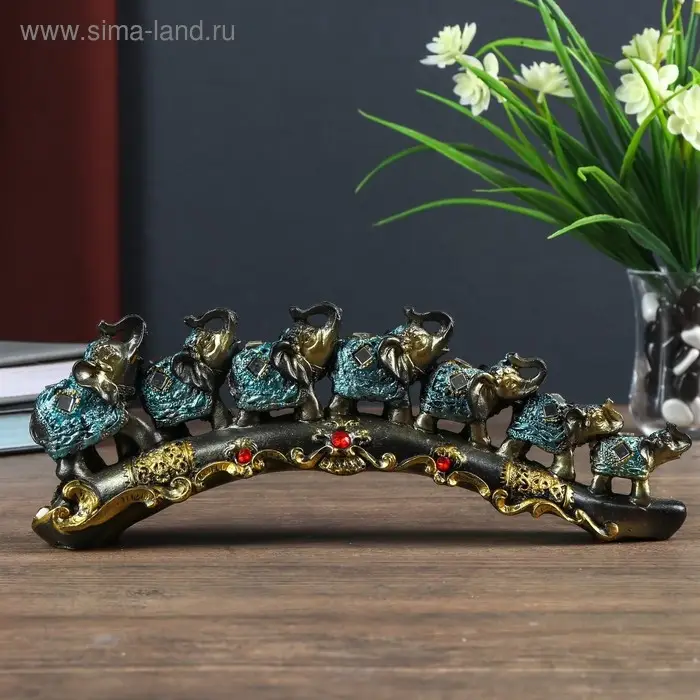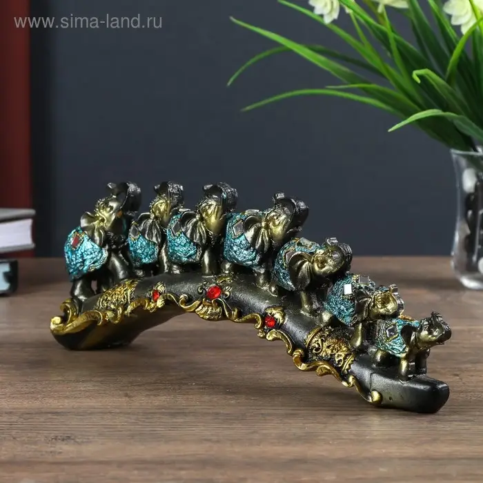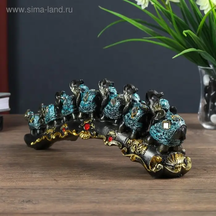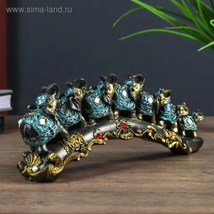 Сувенир полистоун "Семь слонов в синей попоне с кистями и зеркалами на бивне" 10х5,5х28 см