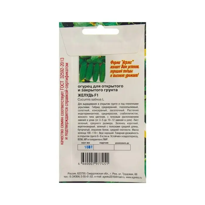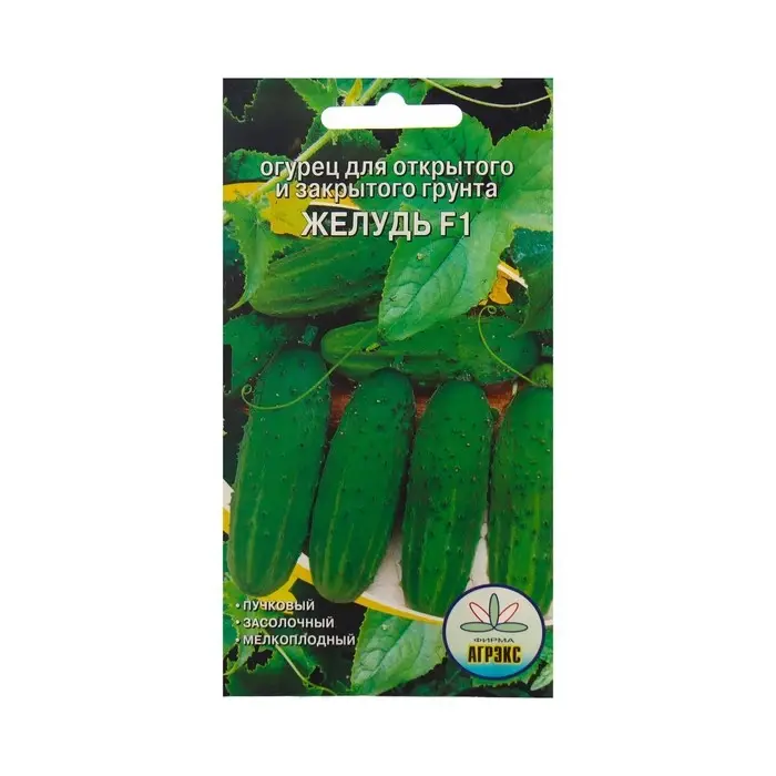 Урожайный пчелоопыляемый пучковый гибрид корнишонного типа для открытого и защищенного грунта. Назван так за плотные хрустящие зеленцы высоких засолочных качеств. Растения женского типа цветения, ветвление ограничено (боковые побеги – короткие, детерминантного типа). В узлах формируется от 2-3 до 10-12 завязей. F1 Желудь — гибрид с ценным признаком - замедленным ростом плодов, которые из-за этого долго не перерастают! Создан для бочкового засола, а также для консервирования мини-огурцов в банках. Зеленцы крупнобугорчатые, белошипые, интенсивно-зеленой окраски, длиной 8-11 см; частота расположения бугорков средняя. Устойчив к оливковой пятнистости, вирусу огуречной мозаики, толерантен к мучнистой росе, ложной мучнистой росе. К гибриду подсевают 10% опылителя (на 10 растений гибрида 1 растение опылителя).