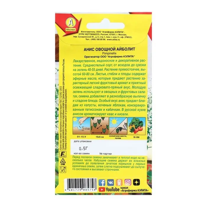 Среднеспелый сорт, период от полных всходов до срезки на зелень 40-55 дней. Растение средней высоты, прямостоячее. Масса одного растения 50-55 г. Урожайность зелени 1,7-1,9 кг/м2. Листья, стебли и плоды содержат эфирные масла, которые придают растению характерный легкий фруктовый аромат и приятный освежающий сладковато-пряный вкус. Молодую зелень аниса используют в овощных и фруктовых салатах и гарнирах, семена добавляют в разнообразную выпечку и сладкие блюда. Особый вкус анис придает блюдам из капусты, моченым яблокам, применяется при консервировании патиссонов, молодых кабачков. Имеет значение как хороший медонос, лекарственное и декоративное растение.