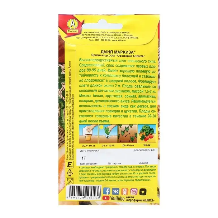 Высокопродуктивный сорт ананасного типа. Скороспелый - вегетационный период 70-80 дней. Имеет хорошую полевую устойчивость к комплексу болезней, стабильно плодоносит в средней полосе. Формирует плети длиной около 2 м. Плоды овальные, ярко-желтые, со сплошным сетчатым рисунком, массой 1,5-2 кг. Мякоть белая с розовато-кремовым оттенком, сочная, ароматная, тающая, сладкая, деликатесного вкуса. Рекомендуется использовать в свежем виде как десерт, для приготовления повидла и цукатов.