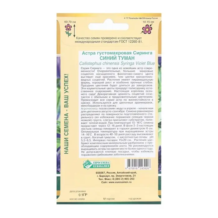 Семена Цветов Астра Сиринга Синий Туман, 0,1 г