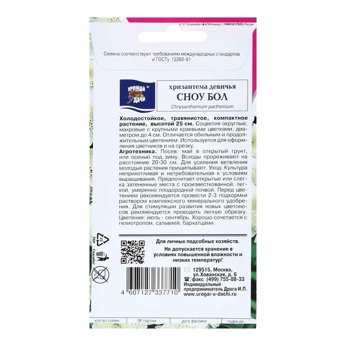 Семена цветов Хризантема девичья "Сноу Бол", 0,05 г