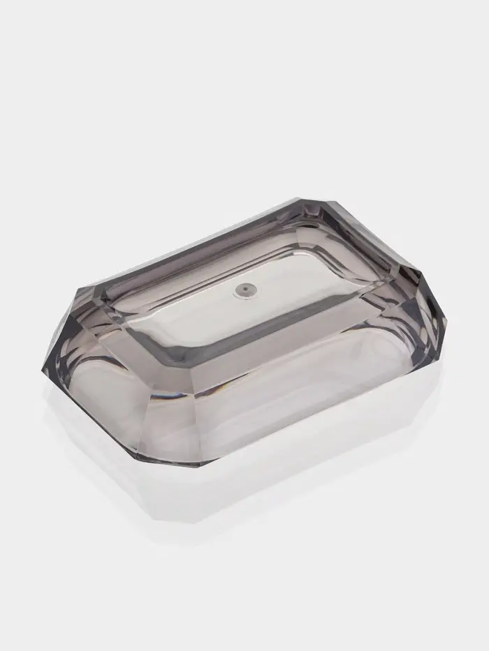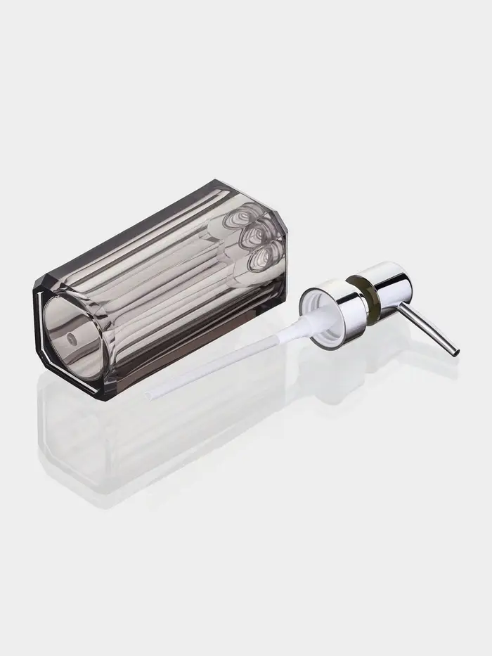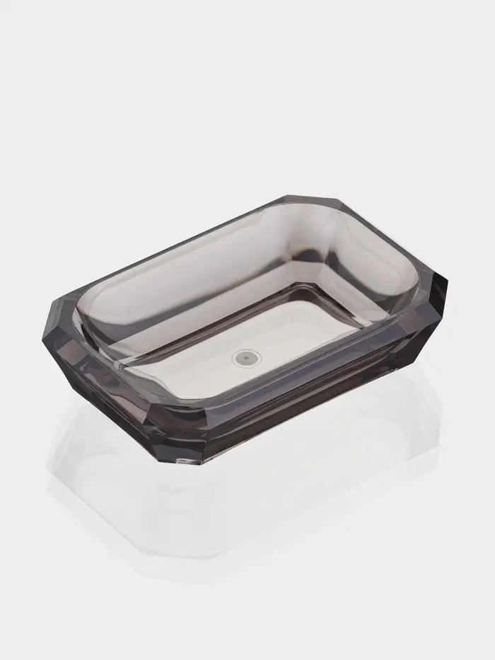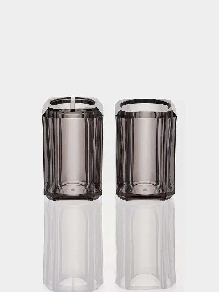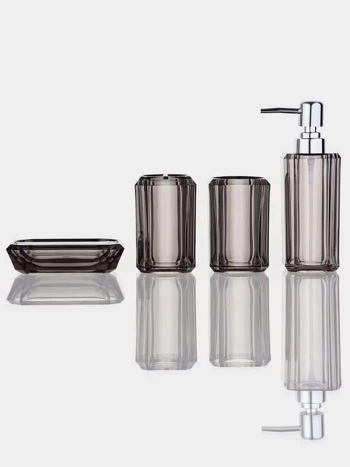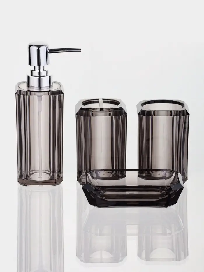 Акриловый набор для ванной «Кристалл» выполнен в оттенке прозрачно-чёрного — глубоком, но не плотном, с лёгким намёком на прозрачность. В комплекте четыре предмета: дозатор, мыльница и два стакана. Такой выбор подходит тем, кто ищет баланс между выразительностью и лёгкостью в интерьере ванной комнаты. Однотонный дизайн без рисунков не создаёт визуального шума и легко сочетается с любой сантехникой и отделкой.