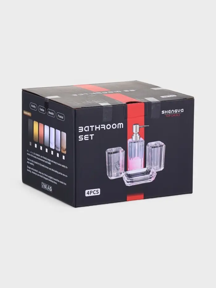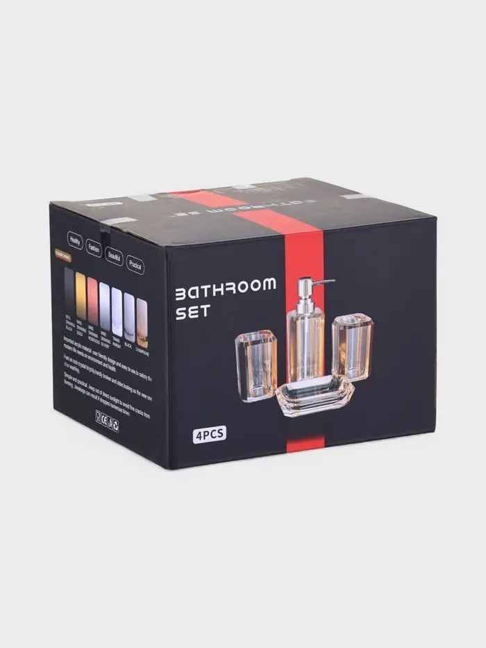 - Четыре предмета в наборе: дозатор для жидкого мыла, мыльница и два стакана для зубных щёток или бритвенных принадлежностей.
