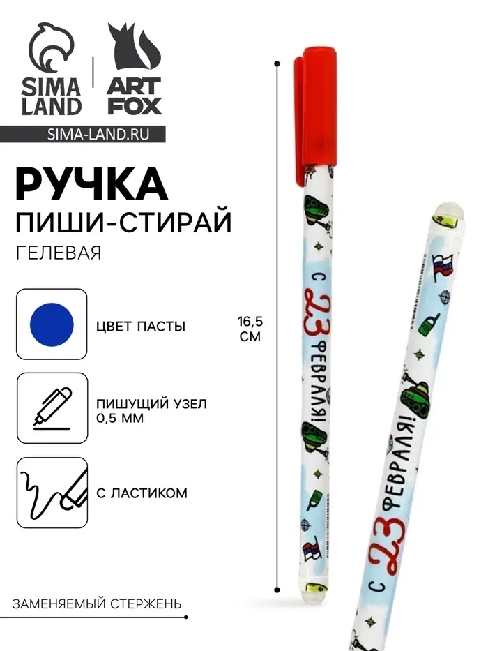 Ручка пиши-стирай, синяя паста, гелевая, 0.5 мм, пластик «С 23 февраля!»