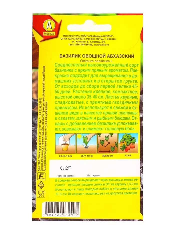 Семена Базилик овощной Абхазский, Ц/П,0,2 г