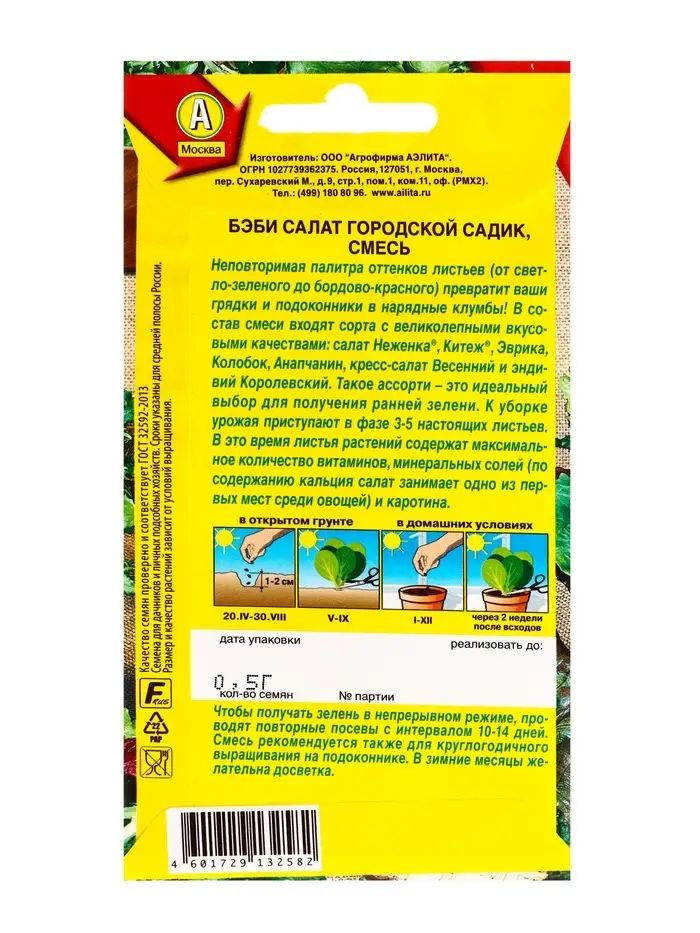 Семена Бэби салат Городской садик, смесь, Ц/П,0,5 г