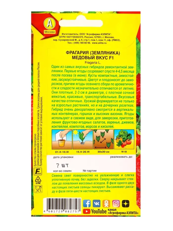 Семена Земляника ремонтантная крупноплая Медовый вкус F1, Ц/П,7 шт.