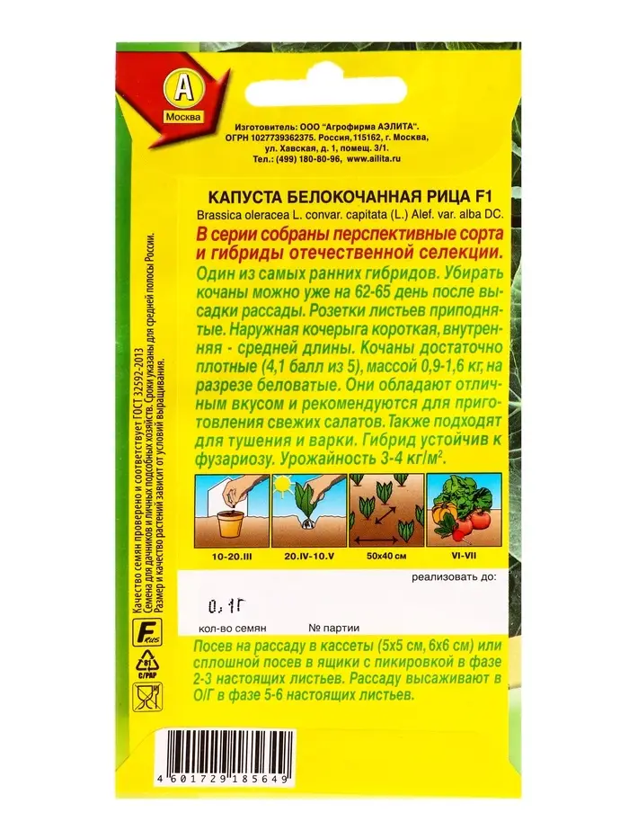 Семена Капуста б/к Рица F1 Р Отечественная С.екция, Ц/П,0,1 г