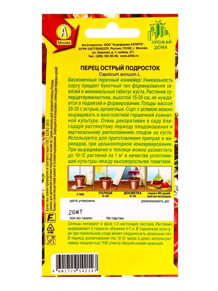 Семена Перец острый Подросток Урожай дома, Ц/П,20 шт.