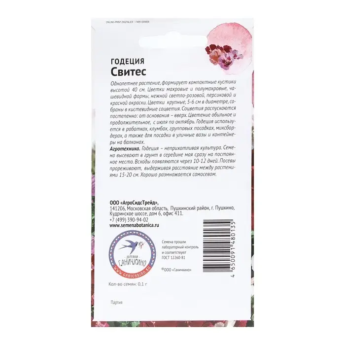 Семена Цветов Годеция «Свитес», 0.1 г, «Агросидстрейд»