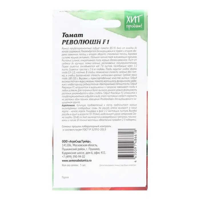 Революшн F1 – ранний полудетерминантный гибрид томата (85-95 дней от всходов до начала созревания). Рекомендуется для выращивания в первом и втором обороте пленочных теплиц и втором обороте стеклянных теплиц. Корневая система мощная, активная, с большим количеством всасывающих корешков. Растение сильное, генеративного типа, хорошо сбалансированное. Лист от среднего до крупного, темно-зеленый, расположение полугоризонтальное. Первое соцветие закладывается над 7-8 листом, последующие через 1-2 листа. Соцветие простое с 5-6-ю плодами.