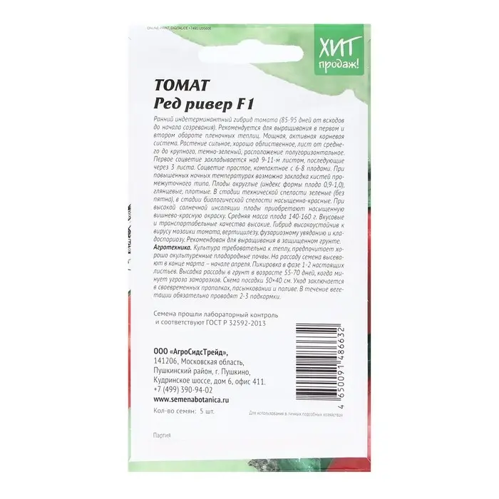 Ред Ривер F1 – ранний индетерминантный гибрид томата (85-95 дней от всходов до начала созревания). Рекомендуется для выращивания в первом и втором обороте пленочных теплиц. Мощная, активная корневая система. Растение сильное, хорошо облиственное, лист от среднего до крупного, темно-зеленый, расположение полугоризонтальное. Первое соцветие закладывается над 9-11 листом, последующие через 3 листа. Соцветие простое, компактное с 6-8-ю плодами. При повышенных ночных температурах возможна закладка кистей промежуточного типа.