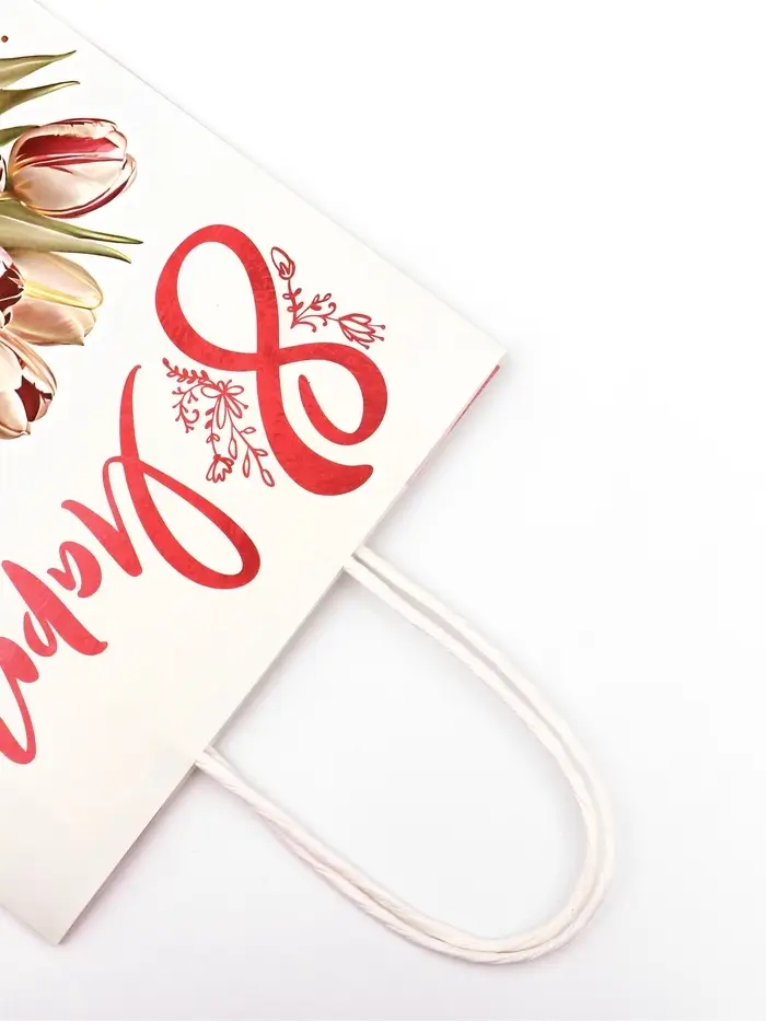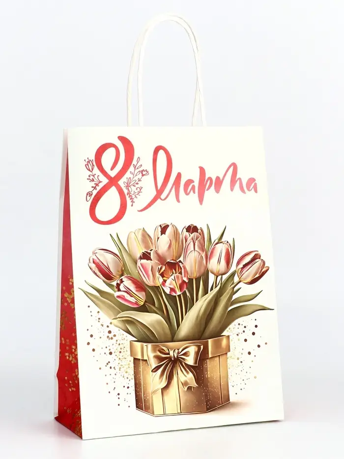 Этот пакет крафт на 8 Марта создан специально для того, чтобы сделать ваш подарок девушке ещё более особенным. Плотность бумаги 120 г/м² гарантирует прочность и надёжность пакета, позволяя безопасно переносить даже хрупкие и ценные вещи.