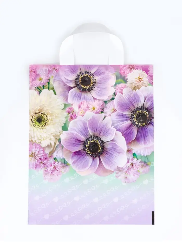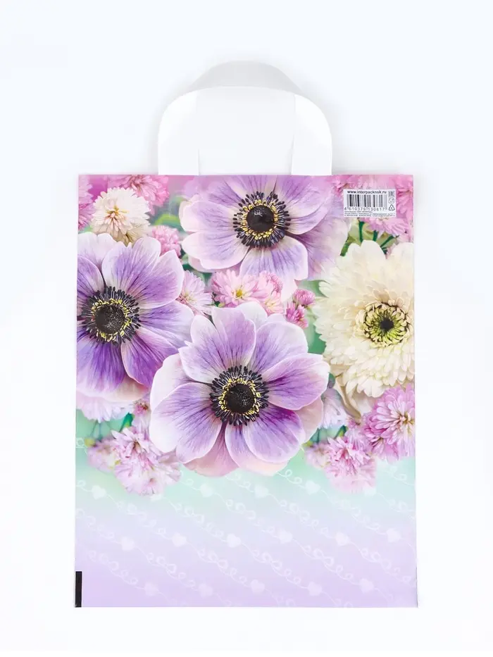 Изящная упаковка для трогательных подарков! Подарочный пакет «Анемона» с цветочным принтом — это нежное решение для подарков женщинам. Сиреневый фон и композиция из цветов и сердечек создают романтическое настроение.