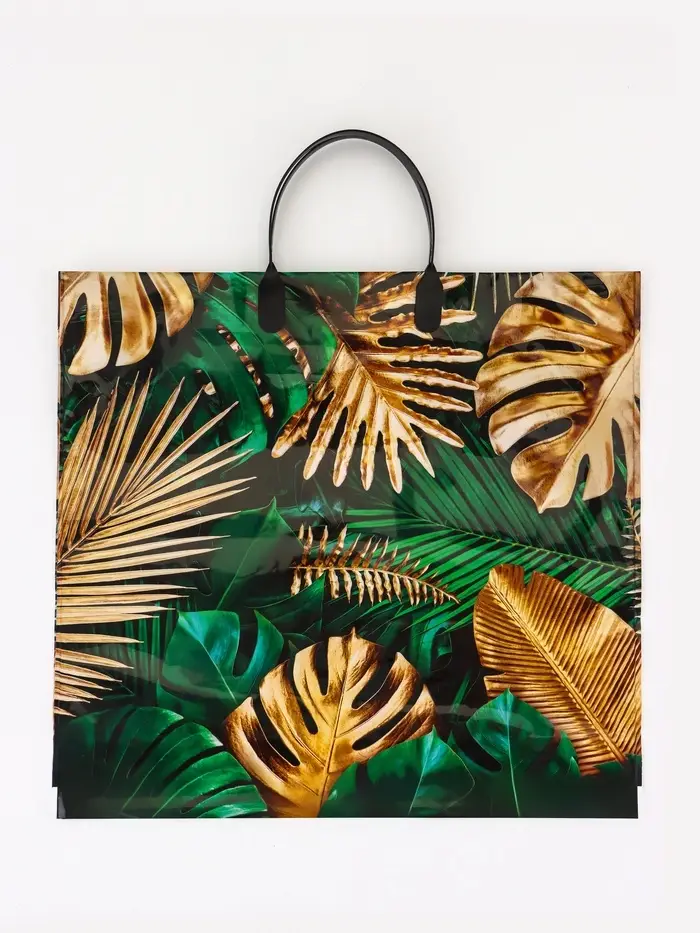 Роскошь природных мотивов! Подарочный пакет «Райский сад» с пластиковой ручкой — это изысканное решение для особенных подарков. Сочетание зеленого фона и золотистых растительных узоров создает атмосферу благородства.