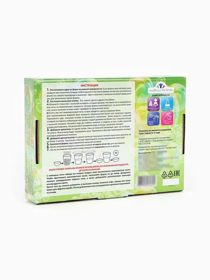 Этот творческий набор идеально подходит для детского досуга, развития фантазии и знакомства с основами мыловарения.