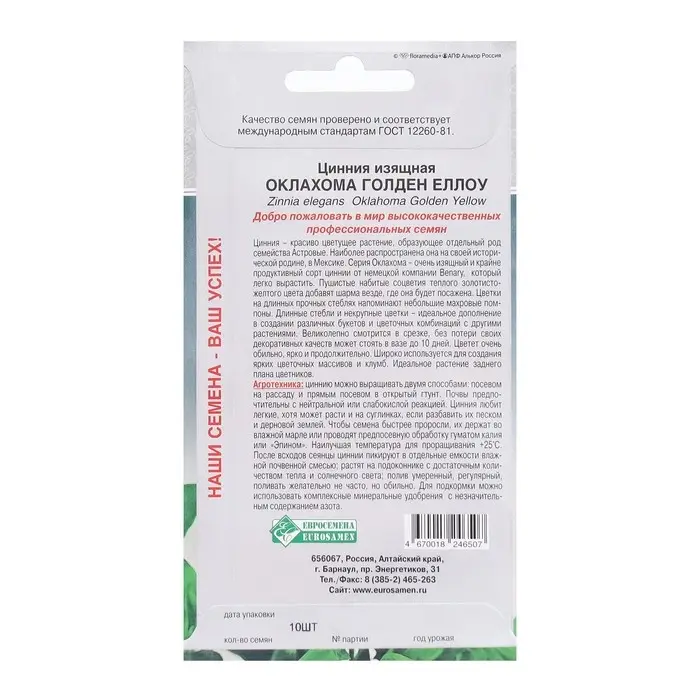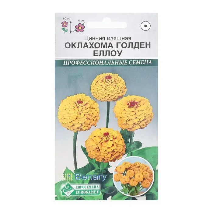 Цинния – красиво цветущее растение, образующее отдельный род семейства Астровые. Наиболее распространена она на своей исторической родине, в Мексике. Серия Оклахома - очень изящный и крайне продуктивный сорт циннии от немецкой компании Benary, который легко вырастить. Пушистые набитые соцветия теплого золотисто-желтого цвета добавят шарма везде, где она будет посажена. Цветки на длинных прочных стеблях напоминают небольшие махровые помпоны. Длинные стебли и некрупные цветки – идеальное дополнение в создании различных букетов и цветочных комбинаций с другими растениями. Великолепно смотрится в срезке, без потери своих декоративных качеств может стоять в вазе до 10 дней. Цветет очень обильно, ярко и продолжительно. Широко используется для создания ярких цветочных массивов и клумб. Идеальное растение заднего плана цветников.