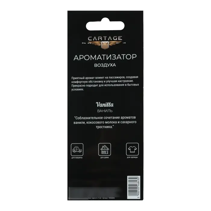 Картонный корпус ароматизатора подчеркивает его легкость и удобство в использовании. Просто повесьте его в удобном для вас месте, например, на зеркале заднего вида в автомобиле или в шкафу, и наслаждайтесь непревзойденным ароматом "Ваниль", который создаст атмосферу свежести и комфорта вокруг вас.