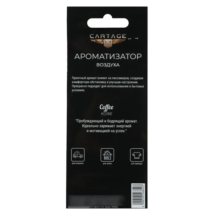 Картонный корпус ароматизатора подчеркивает его легкость и удобство в использовании. Просто повесьте его в удобном для вас месте, например, на зеркале заднего вида в автомобиле или в шкафу, и наслаждайтесь непревзойденным ароматом "Кофе", который создаст атмосферу свежести и комфорта вокруг вас.