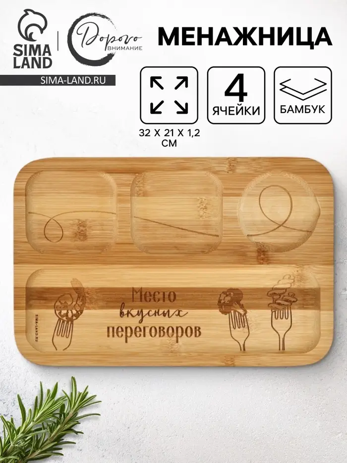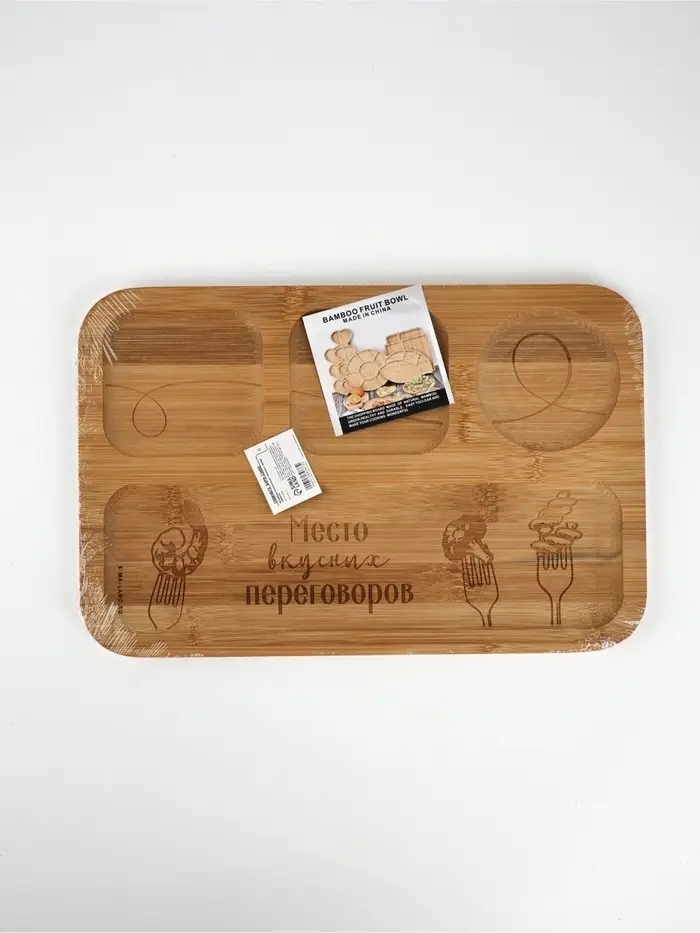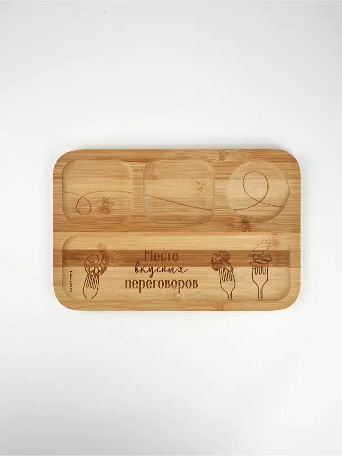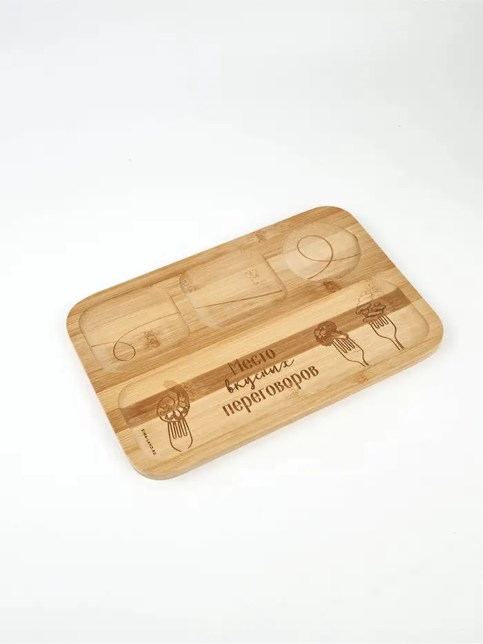 Менажница «Вилочки» — это приглашение к столу, вырезанное в бамбуке. Её бежевая поверхность, как лист бумаги перед первым предложением, и гравировка: четыре ячейки, с рисунком вилок и намёком на блюдо, а в центре — фраза: «Место вкусных переговоров». Не формальное собрание. Не банкет. А именно — *переговоры*: про важное, про смешное, про то, что лучше всего обсуждается с кусочком сыра в руке и чашкой чая рядом.