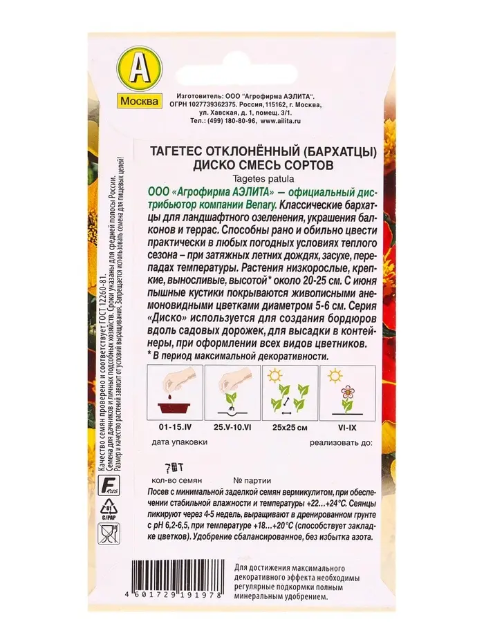Семена цветов Бархатцы Диско отклоненные, смесь сортов Спецсерия Benary, Ц/П,7 шт.