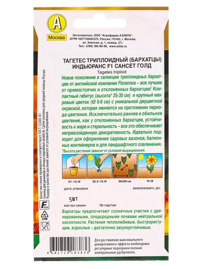 Семена цветов Бархатцы Индьюранс F1 сансет голд С. Floranova Золотая серия, Ц/П,5 шт.