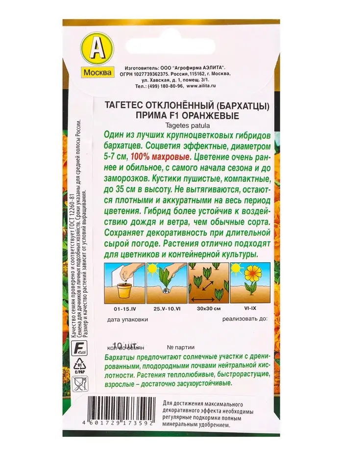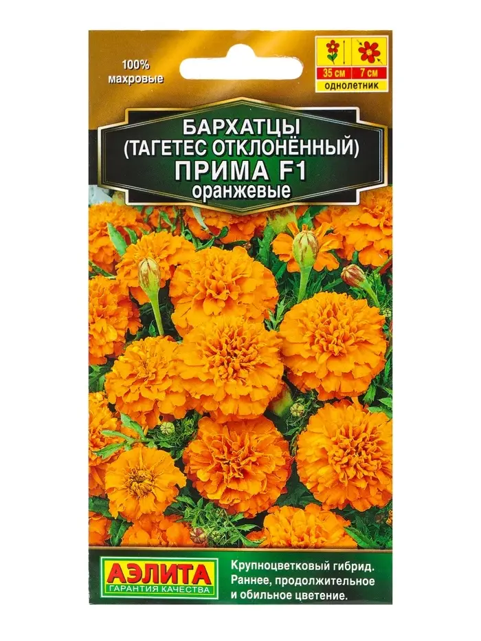 Семена цветов Бархатцы Прима оранжевые F1 отклоненные Золотая серия, Ц/П,10 шт.