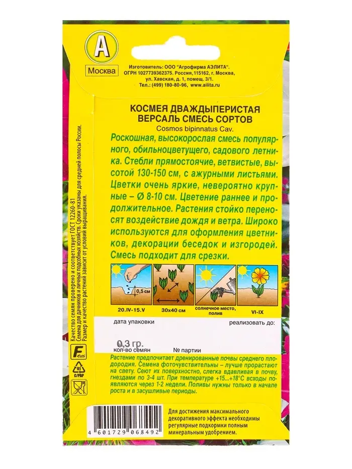 Семена цветов Космея Версаль, смесь сортов , Ц/П,0,3 г