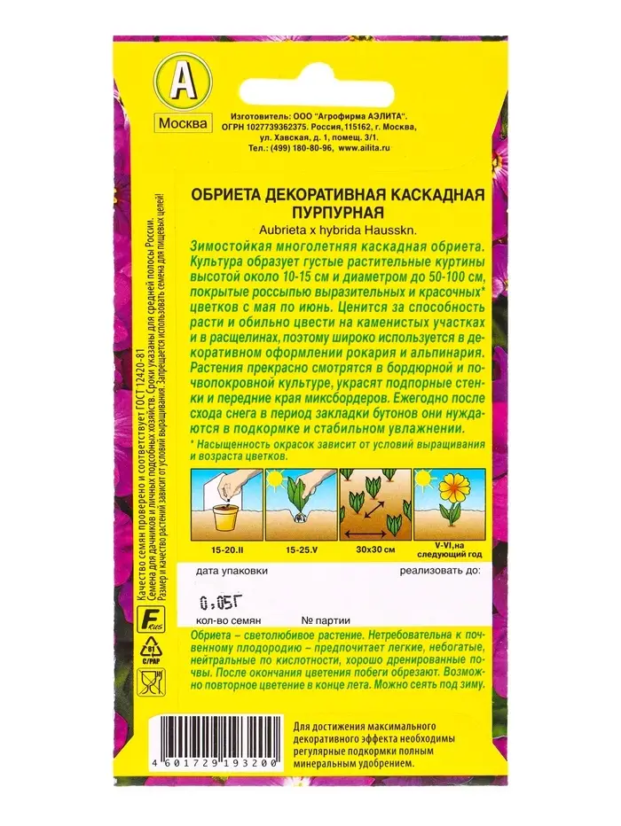 Семена цветов Обриета Декоративная каскадная пурпурная Мн, Ц/П,0,05 г