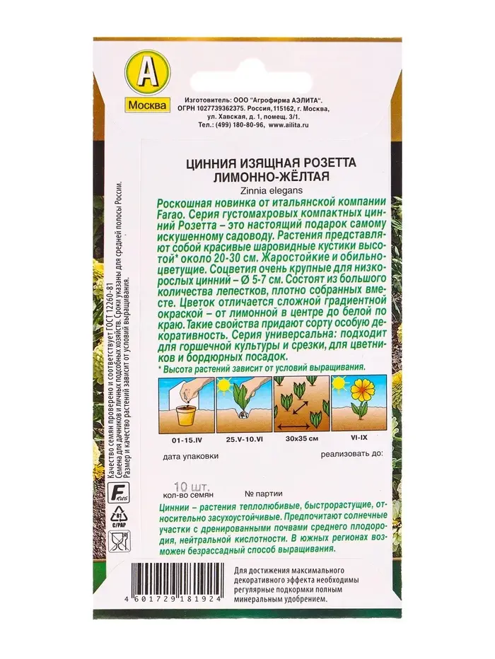 Семена цветов Цинния Розетта лимонно-желтая С. Farao Золотая серия, Ц/П,10 шт.