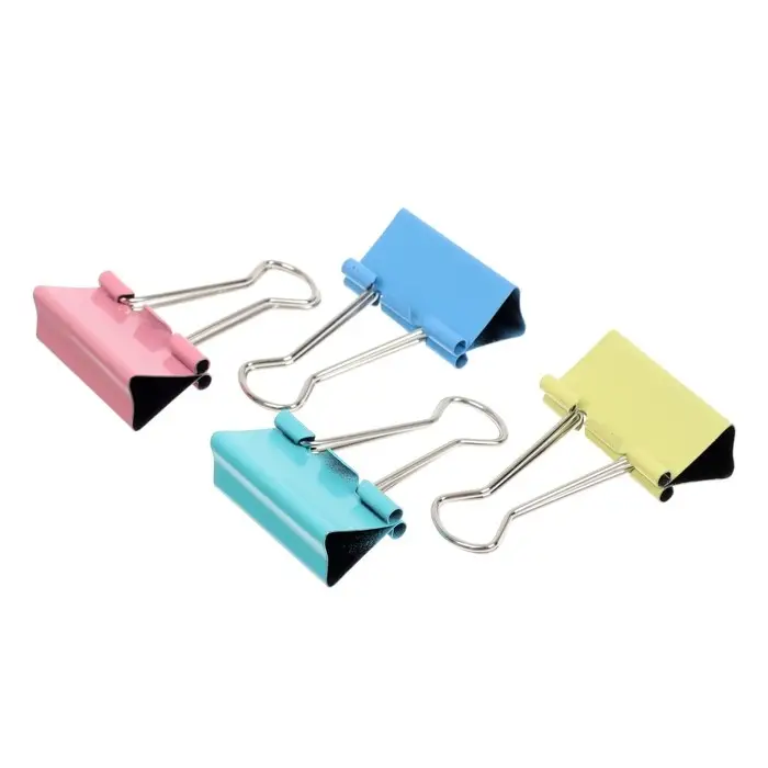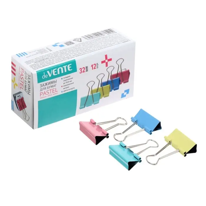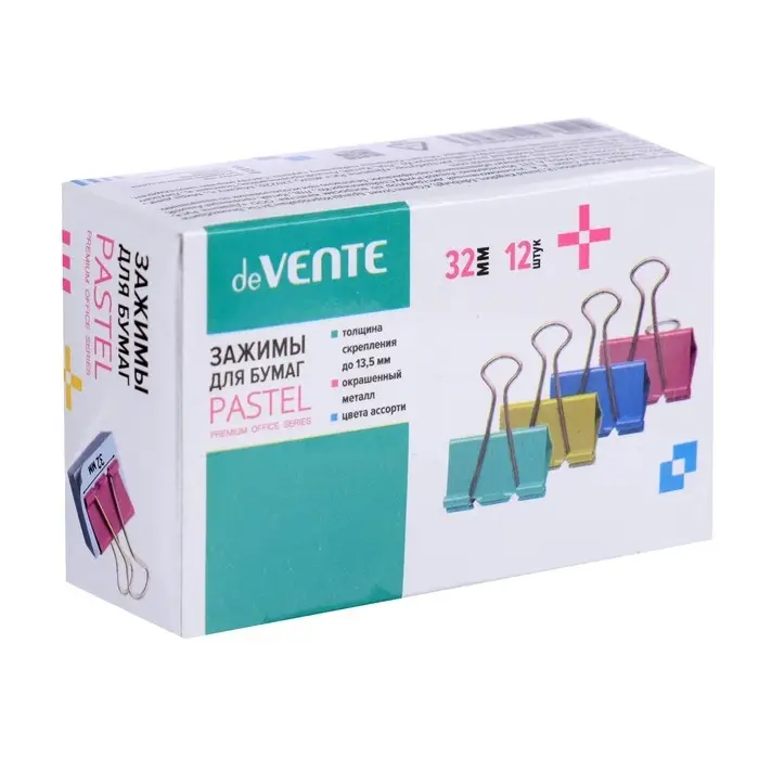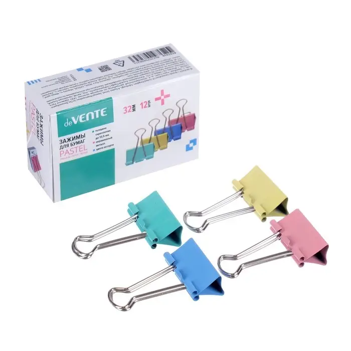 Зажим для бумаг deVENTE. Pastel металлический (32 мм) толщина скрепления до 13,5 мм, цветной ассорти, 12 штуки в картонной коробке