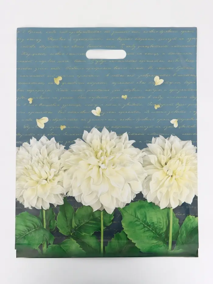 Для цветочных салонов и сувенирных магазинов: Донная складка обеспечивает устойчивость на транспортных лентах. Голубой фон гармонирует с пастельной палитрой весенних коллекций. Пакет используют для упаковки парфюмерных наборов, текстильных изделий и праздничных композиций. Плотность материала соответствует стандартам профессиональной упаковки.