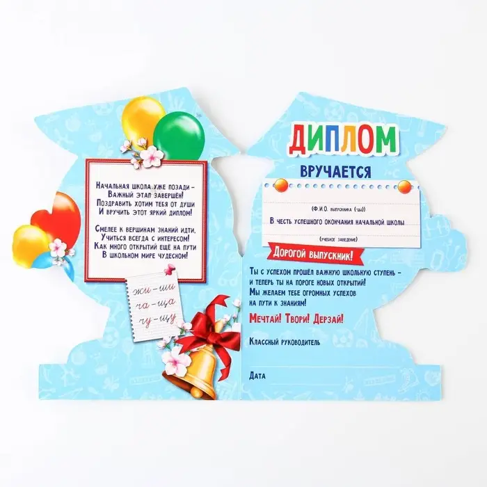 Диплом "Выпускнику начальной школы!" тиснение, лента с шарами, 22х16,5 см
