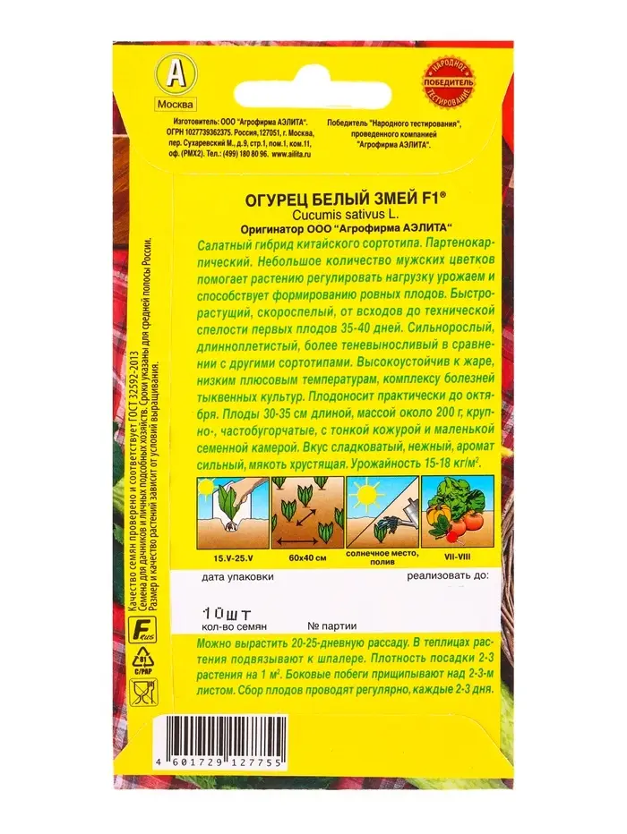Семена Огурец китайский Белый змей F1 Парт, Ц/П,10 шт.