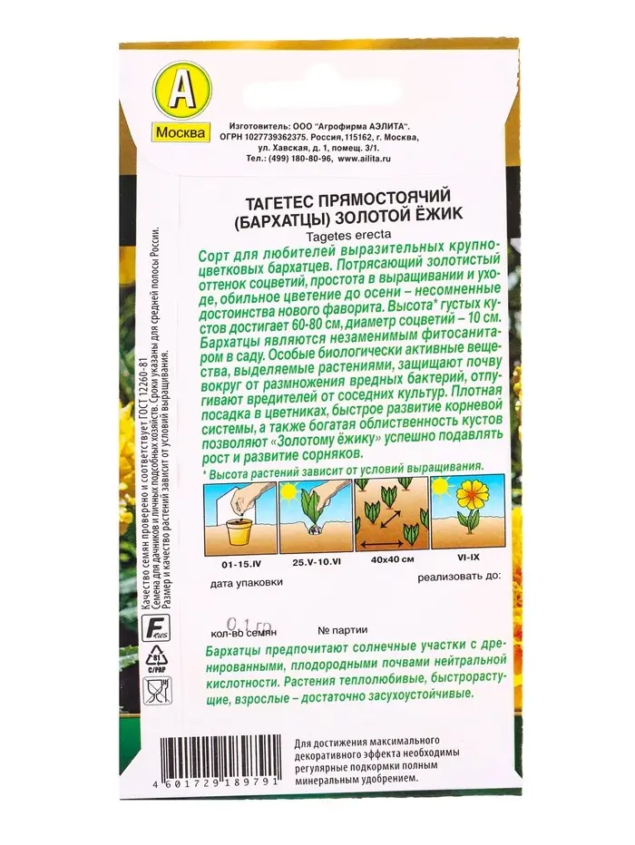 Семена цветов Бархатцы Золотой ёжик прямостоячие Золотая серия, Ц/П,0,1 г