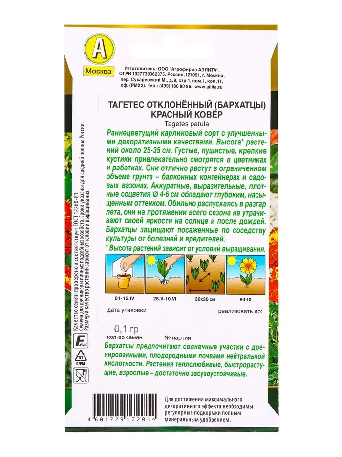 Семена цветов Бархатцы Красный ковер отклоненные Золотая серия, Ц/П,0,1 г
