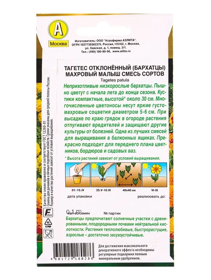 Семена цветов Бархатцы Махровый малыш отклоненные, смесь сортов Золотая серия, Ц/П,0,1 г