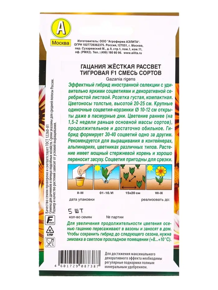 Семена цветов Гацания Рассвет F1 тигровая, смесь сортов Золотая серия, Ц/П,5 шт.