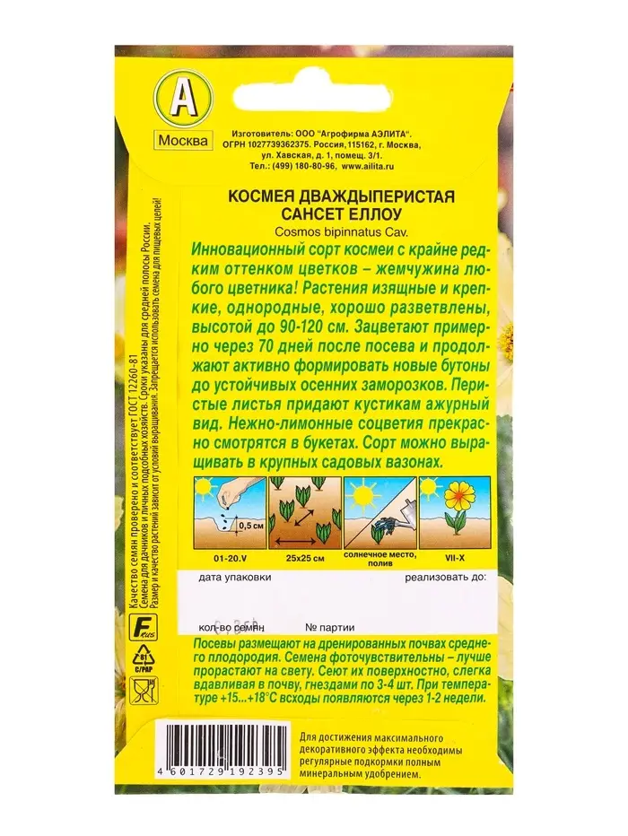 Семена цветов Космея Сансет еллоу , Ц/П,0,3 г