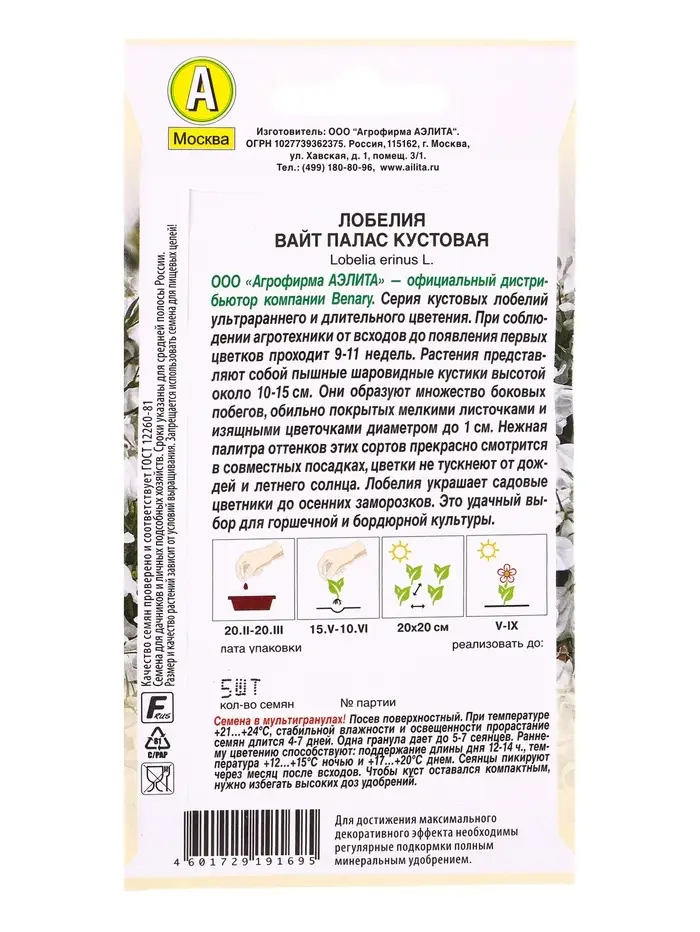 Семена цветов Лобелия Вайт палас кустовая (драже в пробирке) Спецсерия Benary, Ц/П,5 шт.