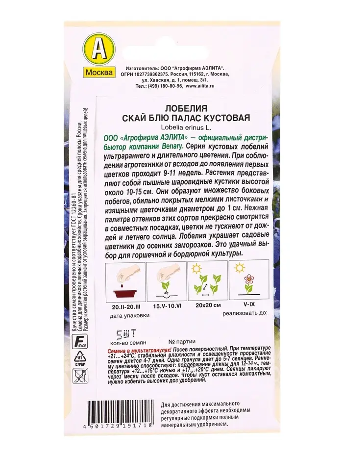 Семена цветов Лобелия Скай блю палас кустовая (драже в пробирке) Спецсерия Benary, Ц/П,5 шт. 109455