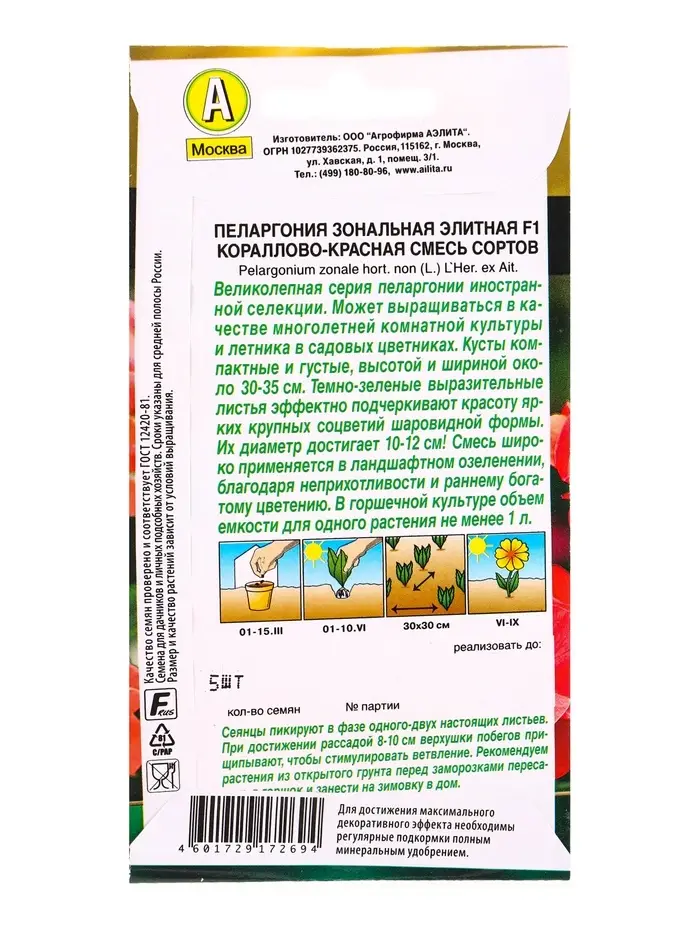 Семена цветов Пеларгония Элитная F1 кораллово-красная, смесь сортов Мн Золотая серия, Ц/П,5 шт. 1094