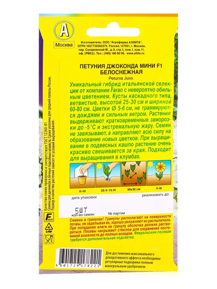 Семена цветов Петуния Джоконда мини F1 белоснежная (драже в пробирке) С. Farao, Ц/П,5 шт.