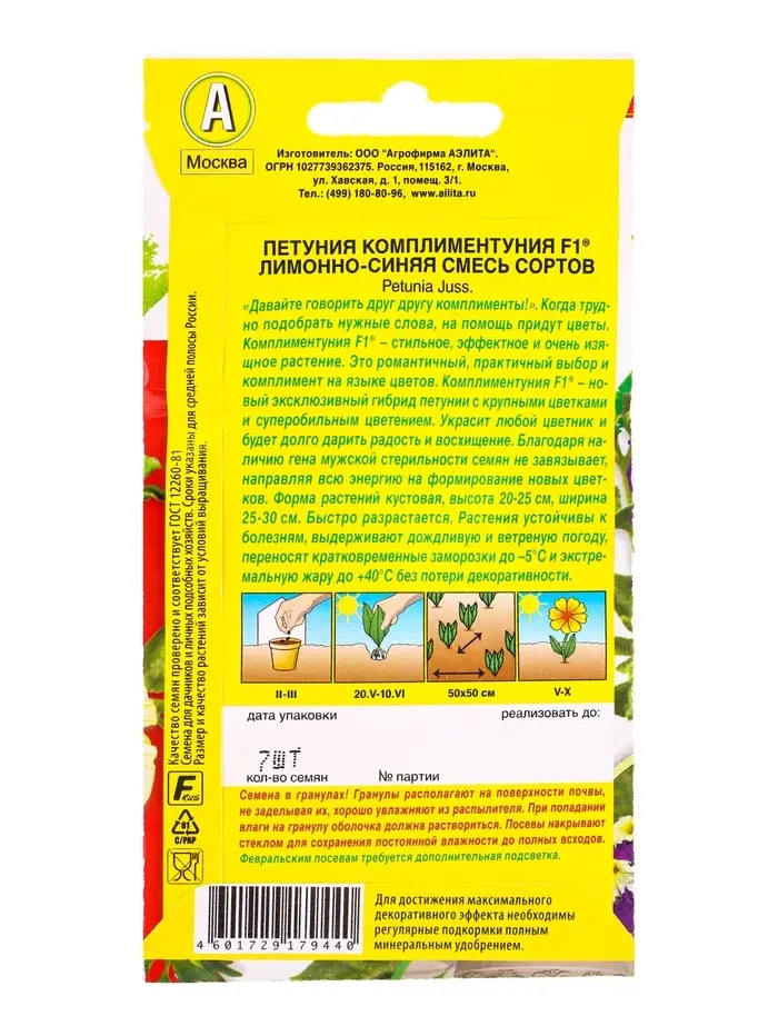 Семена цветов Петуния Комплиментуния F1 лимонно-синяя смесь крупноцветковая (драже), Ц/П,7 шт. 10945