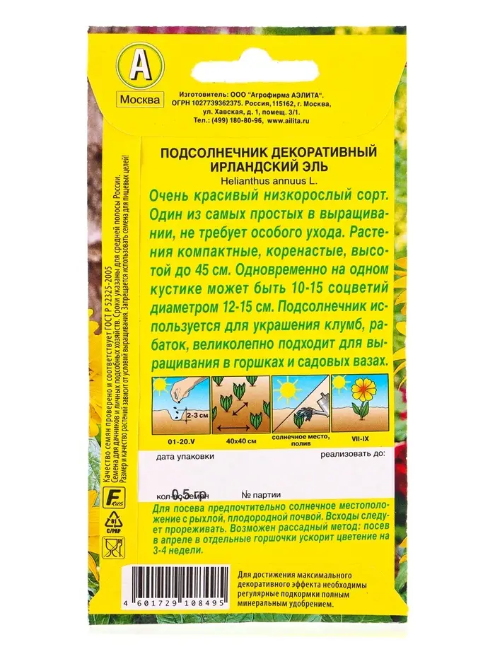 Семена цветов Подсолнечник Ирландский эль , Ц/П,0,5 г