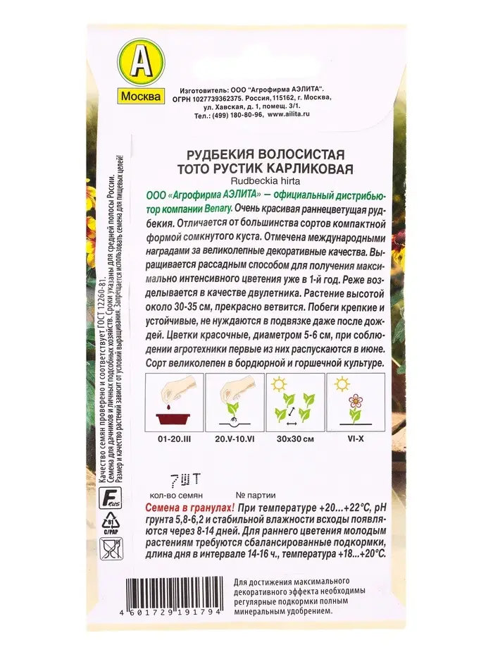 Семена цветов Рудбекия Тото Рустик карликовая (драже в пробирке) Спецсерия Benary, Ц/П,7 шт. 109458